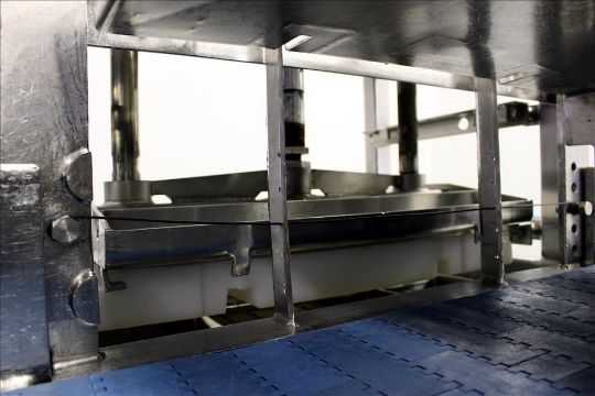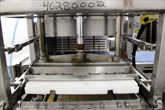 Marchant Schmidt Pneumatic Cheese Cubing Machine, Model MS80. Machine is rated at speeds up to 10,000 pounds per hour. Handles (2) 40 pound blocks of cheese, 2 blocks per cycle. Designed for hard cheese cutting (Parmesan, Romano, etc). Handles rectangular cheese blocks up to 14" wide x 7" high x 11" deep and round cheese blocks up to 14" diameter x 5" high. Follows USDA dairy guidelines. Has Allen Bradley SLC 5/04 PLC controls. Is of stainless steel construction. 3/60/480V. Serial #5732-001 ****MISSING INFEED GUARD AND SLICING GUARD*** Over-All Dimensions: 100"L X 90"W X 90"H, 1200# (Located in Chicago)