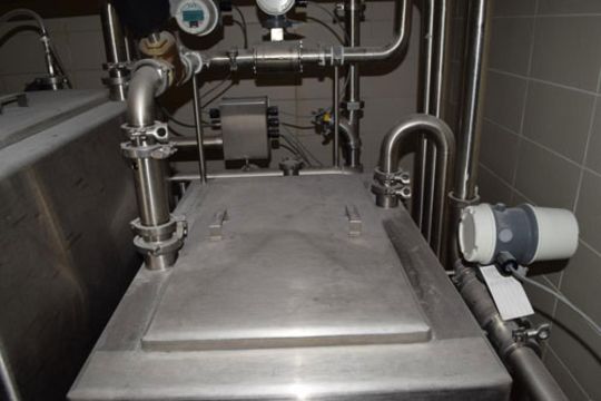 Ecolab CIP System Consisting Of : (2) Approximate 250 Gallon stainless steel tanks, approximate 33" x 40" x 44" tall, (1) approximate 150 gallon stainless steel tank, approximate 26" x 40" x 33" tall, (1) Alfa Laval stainless steel centrifugal pump driven by a 10hp, 3/60/208-230/460 volt, 3500 rpm motor, (1) Enerquip stainless steel U-Tube heat exchanger, (1) control panel with Allen-Bradley PanelView Plus 1250, and miscellaneous valves and piping. Mounted on a stainless steel frame. Ecolab project#37370. Includes miscellaneous valves and piping ***Located in Chicago, IL
