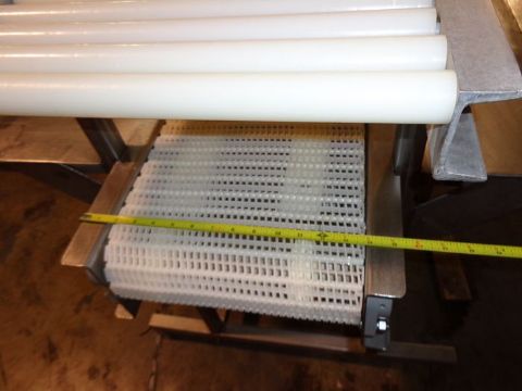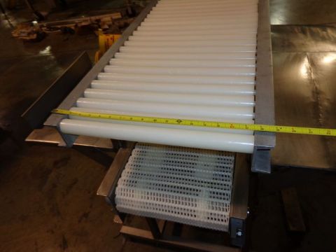 (1) S.S. Conveyor 12" W X 38" Long, top mounted roller conveyor, s.s. packoff trays each (LOCATED IN IOWA, RIGGING INCLUDED WITH SALE PRICE)***EUSA***.