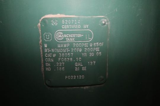 { Group of lots: 120,121 } 2005 Manchester Vertical Air Receiver, Board #520714 , Aprox. 127 Gal., 200 psi @ 65 Degree F