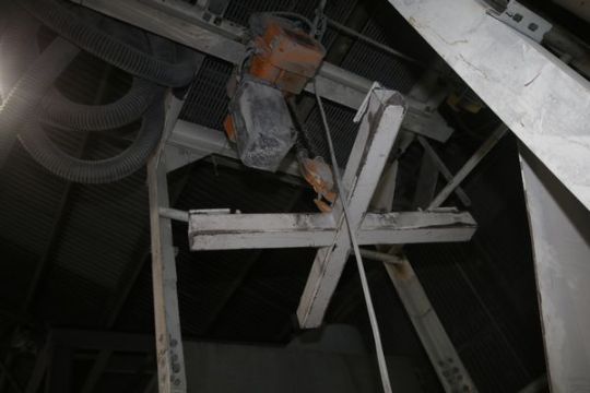{ Group of lots: 54,55,56 } Harrington 3-Ton Electric Hoist with Bulk Bag/Tote Attachment and Crossbeam