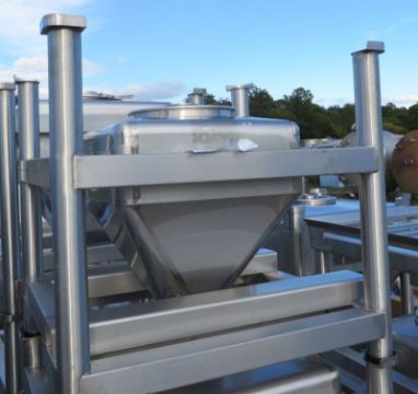 Tote Inc 10 CFT Bin.  75 Gallon Capacity, Stainless Steel.  32" X 28" X 12" Straight Side with a 21" Cone and 10" Diameter Discharge.  Mounted on a Stackable Fork Lift access frame.  18" top-mounted manway (Located in New York) Loading Included in Sales Price