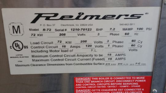 Reimers Model R72 S/N 1210-70123 100 PSI 1.25 HP PACKAGE BOILER SYSTEM (Located in Nevada)