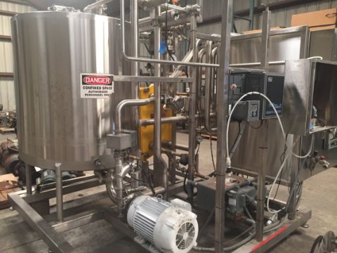 Single Tank Skid-Mounted S/S CIP System, 600 Gallon Dome-Top Tank, ACG Plate Heat Exchanger, Flowverter Panel, SCB 25 HP Centrifugal Supply Pump, Anderson 3" Flowmeter, Hoffman HW, Condensate Unit with (2) Supply Pumps, S/S Control Panel with Allen Bradley Panel View Plus 1,000, Andersopn AV9900 Controller, PH Analyzer, Mounted on S/S Skid