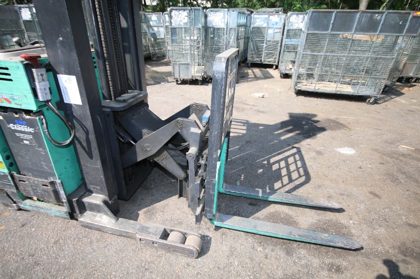 Mitsubishi Stand-Up Narrow Aisle Reach Forklift, M/N ESR36, S/N 1ESR360780, 2,750-4,000 lb. Lifting Capacity, 6933 Hours, with GNB 36 Volt, 18 Cell Battery (Shipping Info.: 8,380 lbs. Dims. 94" L x 44 1/2" W x 134" H; Located in West Berlin, N.J.) (Unit: 60780) (NOTE: Working Condition)