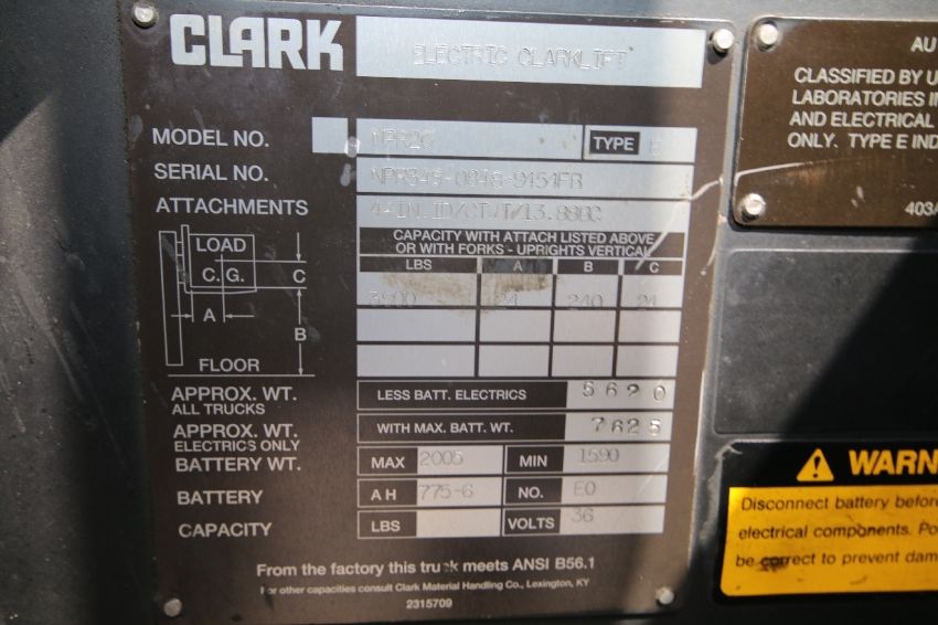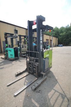 Clark Stand-Up Narrow Aisle Reach Forklift, M/N NPR20, S/N NPR345-0848-9454FB, 2,000 lb. Lifting Capacity, 5,143 Hours, with GNB 36 Volt, 18 Cell Battery (Shipping Info.: 7,625 lbs. Dims. 85" L x 52" W x 108" H; Located in West Berlin, N.J.) (NOTE: Working Condition)