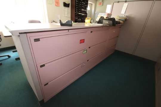 2-Station Computer Work Area with Aprox. 9 ft. 3" L x 2 ft. W Counter, (3) Lateral Cabinets and (2) Steno Chairs (NOTE: Computers and Contents Not Included)