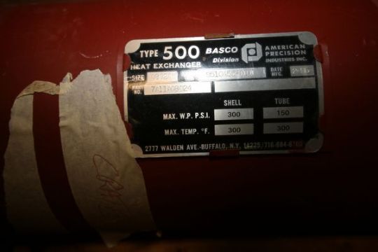 Basco 22-1/2" L Shell and Tube Heat Exchanger, Type 500, Size 08024, S/N 9510455-0101 with S/S Bundle, Max Temp. 300 Degree F, MWP psi 300 Shell and 150 Tube