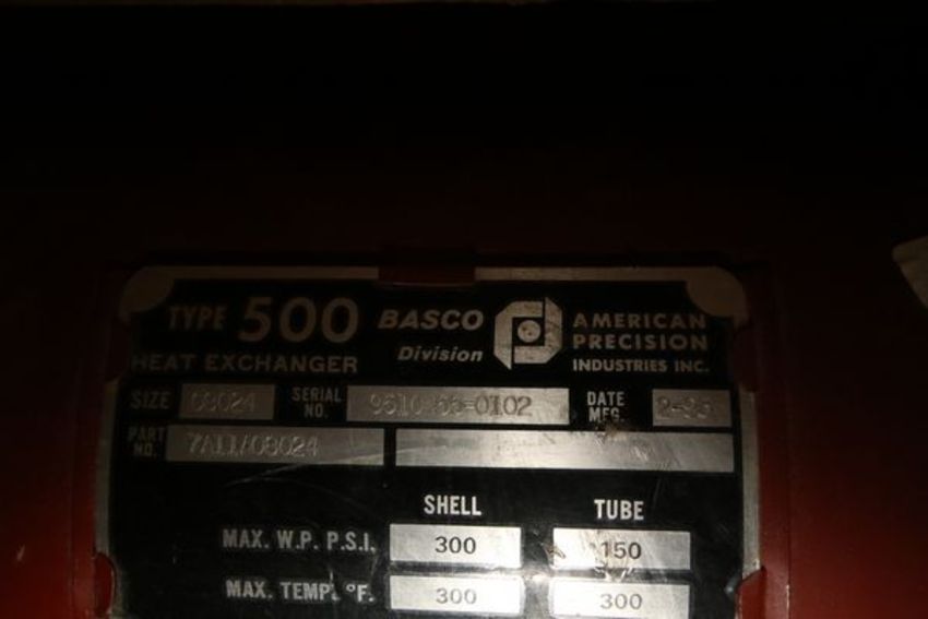 Basco 22-1/2" L Shell and Tube Heat Exchanger, Type 500, Size 08024, S/N 9510455-0102 with S/S Bundle, Max Temp. 300 Degree F, MWP psi 300 Shell and 150 Tube