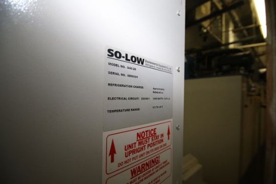SO-LOW Ultra-Low Freezer, M/N U40-28, S/N 0809391, Refrigeration Charge: Aprox. R404A-48 oz., Temperature Range: 0 C to - 40 C, Internal Dimensions: 26 1/2" L x 27" W x 64" H; Overall Dimensions: 69" L x 39" W x 82" H, Mounted on Portable Casters