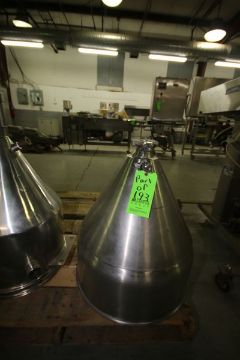 Colborne Single Piston Filler, M/N PF45000, S/N 1006-92, with 17" Dia. with (2) S/S Funnels, 1-S/S Square Type Funnel, Internal Dimensions: 22" L x 22 1/2" W, Overall Dimensions: 21" H x 24" W, Bolt Type Connection and 1- S/S Jacketed Funnel, Bottom Half is Jacketed, 21" Dia., Overall Dimensions: 25" H x 25" W, Bolt Type Connection