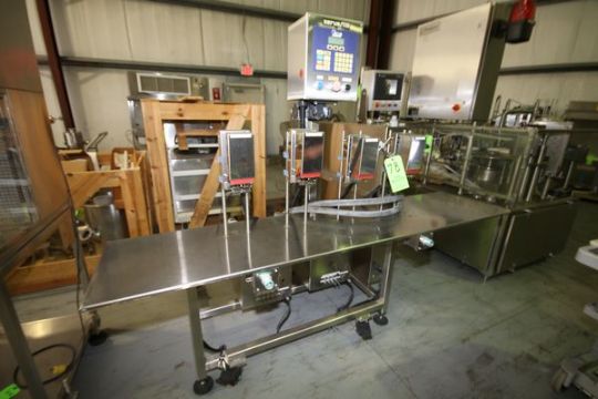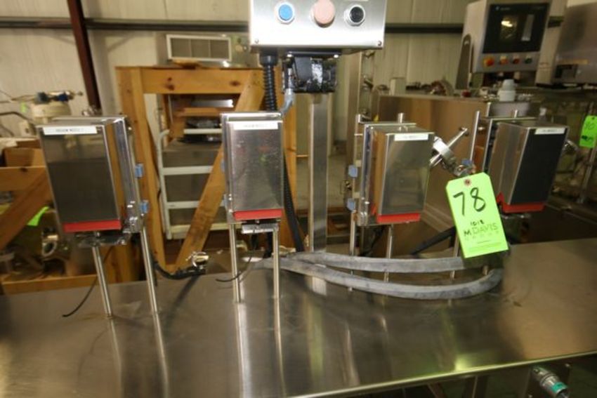 { Choice of lots: 77, 78 (P) } 2004 Oden / Servofill 4-Head Benchtop Filler, Model SFHD MOD, S/N 3217, Currently Equiped with (2) Fill Nozzles & (2) Vacuum Nozzles,Mounted on S/S Frame Equipped with (2) WCB Positive Displacement Pumps, Model 018, S/N 34796203 & 34796103, 1-1/2" S/S Clamp Type Heads, S/S Control Panel with Micrologix 1500 PLC, (4) Input Output & Slots