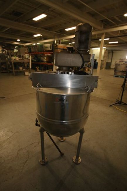 Groen Approx 60 Gallon S/S Jacketed Ketlle, Model RA-60, S/N 03678-1, 100 PSI @ 338 Degree F, 100 PSI @-20 Degree F, Equipped with Sweep-Scrape Agitation, Dual-Paddles / Baffles, 3 HP / 1700 RPM SEW Agitator Motor with Snuggler Drive, National Board # 139475
