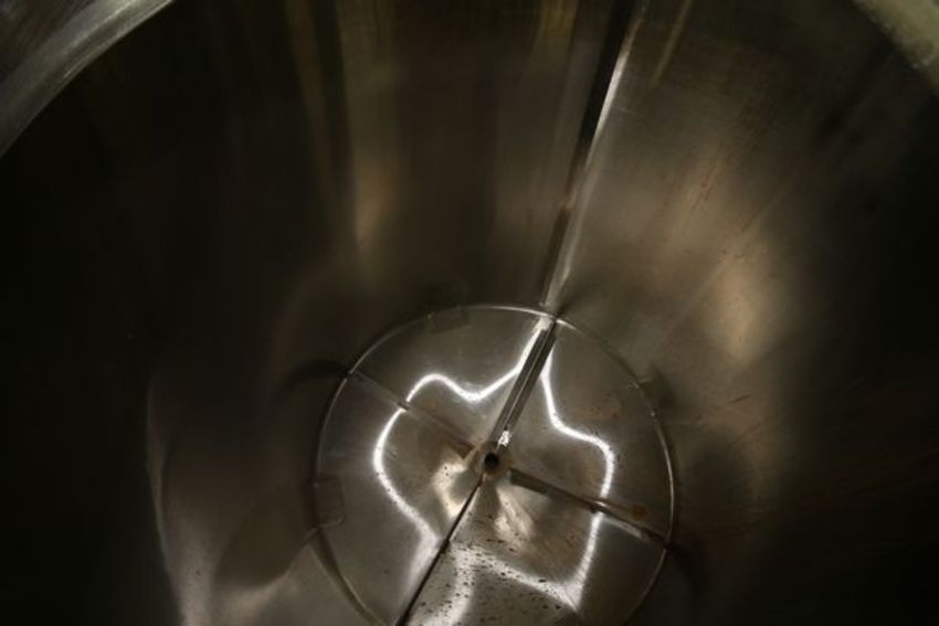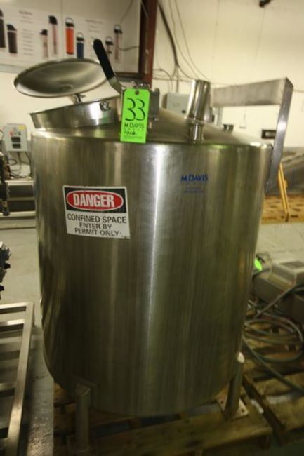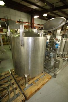 Aprox. 250 Gal. S/S Vertical Tank, Dome-Top Slope Bottom, Mounted on S/S Legs, with Hinge Lid Top Mount S/S Man Door, with Ball Valve, Overall Dimensions: 62" High x 41" Wide