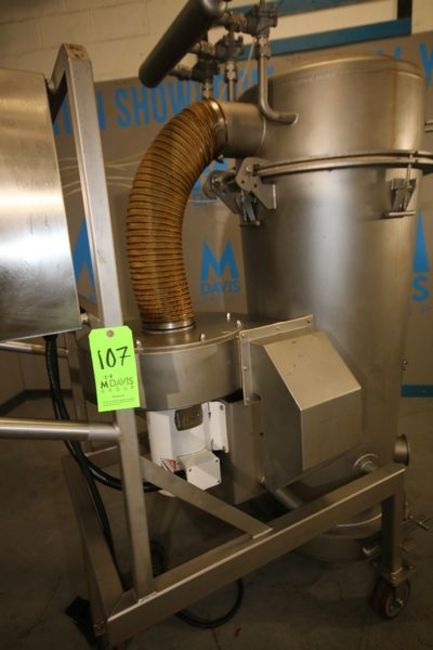 Marchant Schmidt All S/S Cone-Bottom Dust Collector Bag House, ID # 11991001, with (7) Bags, Portable Unit Mounted in S/S Frame with S/S Control Panel on Casters, Baldor 5-HP Motor, 203-230/480, 3450 RPM, Approx. Bag House Dimensions: 63" H x 28" D
