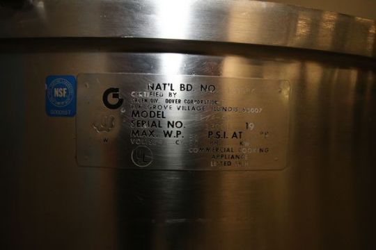 Groen Approx. 40 Gallon Jacketed Tilt Kettle, Model DEE/4-40, S/N 130084, Dual Motion Sweep-Scrape and Prop Agitation, Dresser ½ /.75 hp, 1725/865 RPM Agitator Motor, 50 PSI @ 300 Degree F, 480/3/60