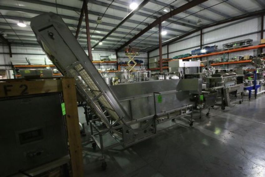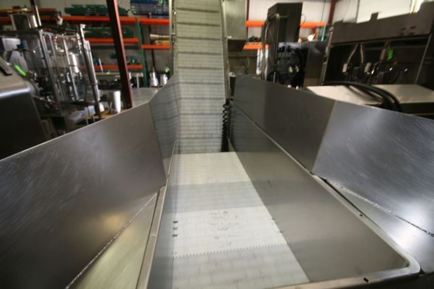S/S Portable Product Hopper with Cleated Incline Conveyor (Product Elevating Conveyor), Mounted on S/S Frame with Casters, Approx. Overall Dimensions: 112" L x 41" W x 99" H, Approx. Product Hopper Dimensions: 86" L x 23" W x 18" D, Elevator Inclines 85" (Total 99" from Ground), 26" W Conveyor Belt
