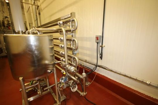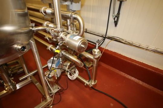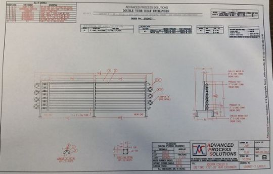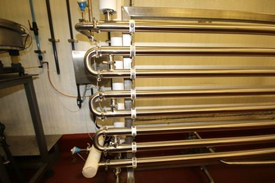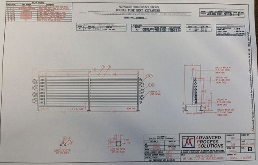 2012 Advanced Process Solutions 316 / 304 S/S Triple Tube Chiller, Model T2WC 312-20 316, S/N S02607, Includes 20 ft L @ 8 Tube Design, WCB & Other S/S Valves & Temp Controls, Design Pressure - 800 psi  @ 250 Degree F, Media Side - 125 psi @ 250 Degree F, Product Volume - 23.6 US Gallon, Chilled Water  Volume - 27.5 US Gallon, Also Includes 50 gal. Skid Mounted S/S Balance Tank