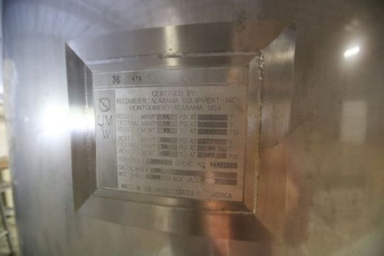 2014 Feldmeier Aprox. 500 Gal. Vertical S/S Juice Chopper Tank, S/N 14A0216, with Bottom Dimple Jacket, Bridge Mounted Agitator, Dual Spray Ball, 304 SS, Jacket MAWP 100 psi @ 200 Degree F, (Aprox. Overall Dimensions – 55” H x 54” W), (Note: Prepares Frozen Blocks of Concentrate)