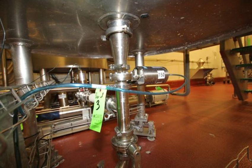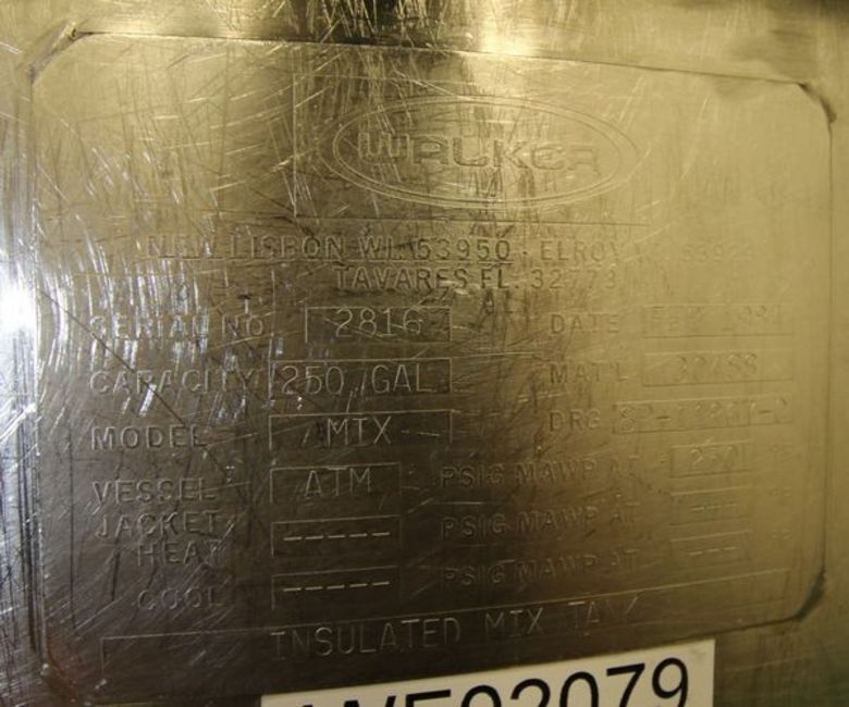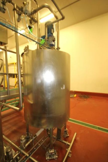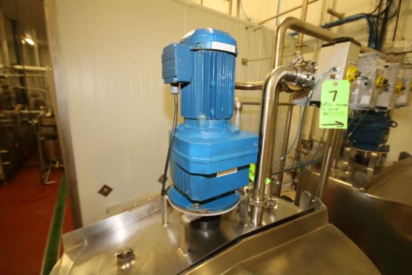 Walker 250 Gal. Insulated Hinged Lid S/S Vertical Mix Tank, Model MIX, S/N 2816, Includes SEW 5 hp 2 - Blade S/S Vertical Top Mounted Mixer @ 1750 RPM, Baffle, Sprayball, Mounted on Load Cells with Digital Read-Out (Located in Lot 10 Control Panel), Also Includes (2) Air Acuated S/S Valves, (Aprox. Overall Tank Dimensions - 9 ft 8" H x 4 ft W)