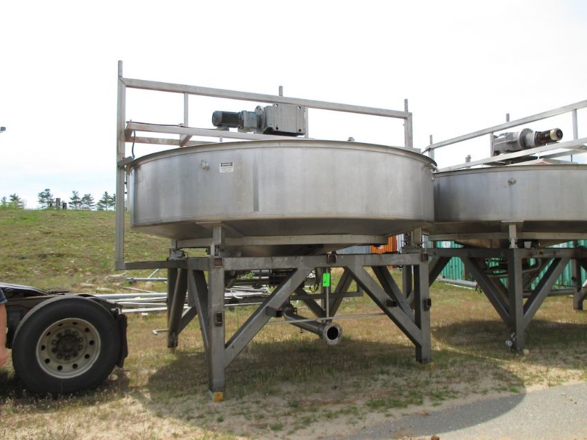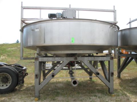 Feldmeier Open Top, Conical Bottom Single Wall Type 304 S/S Cranberry Infusion Tank, 7.5 H.P. InvertaDuty 2-14 RPM Drive, 171" Outside Diameter, 147" Overall Height to Top of Square Stock Frame. (Note; Tanks are Mounted on 60" High Carbon Steel Square Stock Frames, Tanks can be Removed from Frames.) 6" Flange Outlet Valve to Include 6" Butterfly Outlet Valve and 3" Drain Valve, (3) Vibco Inc. Vibratory Units, (4) Model HI SBH04-11.25K Load Cells.