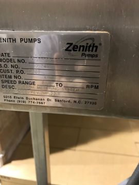 2007 Zenith Metering Pump. Model 60-20000-2422-4.Custom metering pump capable of running as low as 30cc.  Explosion proof motor.  Full wash down including panel.  1.5in inlet and outlet that can be change out to larger or smaller fittings.  No rigging or crating fees (Located in OH)***ANNF***