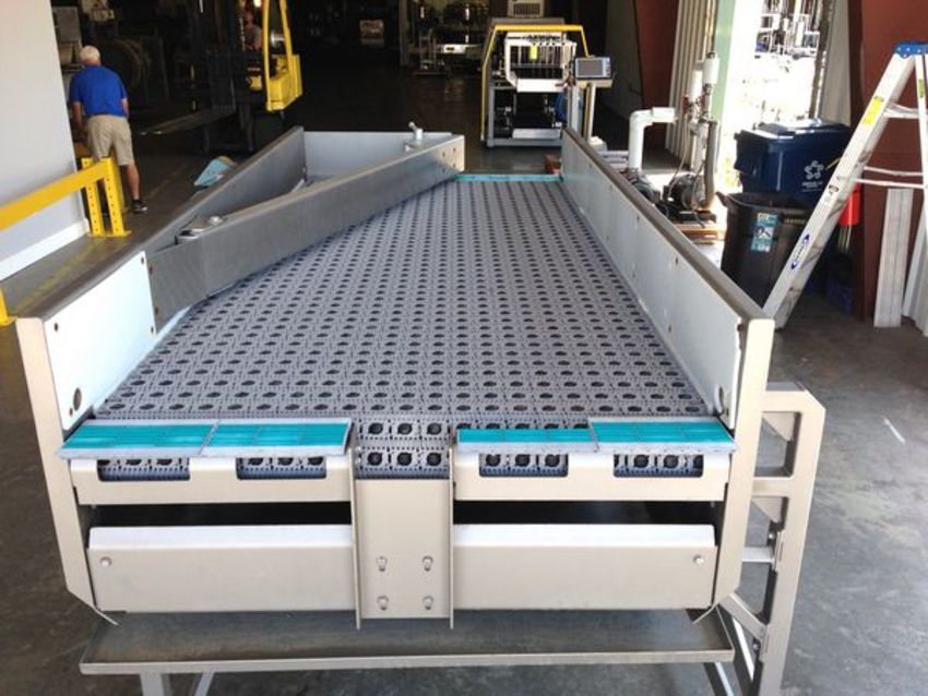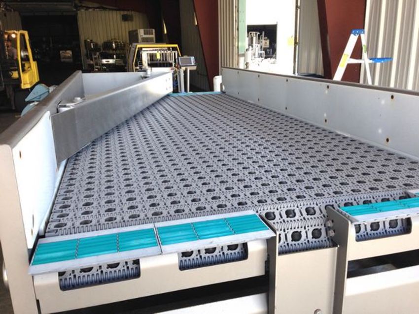 Intralox 2 to 1 Case Combiner Job Number: 5347 SO Number: 6594 Year: 2009 Measures 5 feet long x 4 feet wide, uses a plastic belting with rubber rollers to combine 2 lines of product into one, like new condition, 2HP Motor – 460 volts, adjustable guide rail for different case widths (Located in NC) ***FBEV***