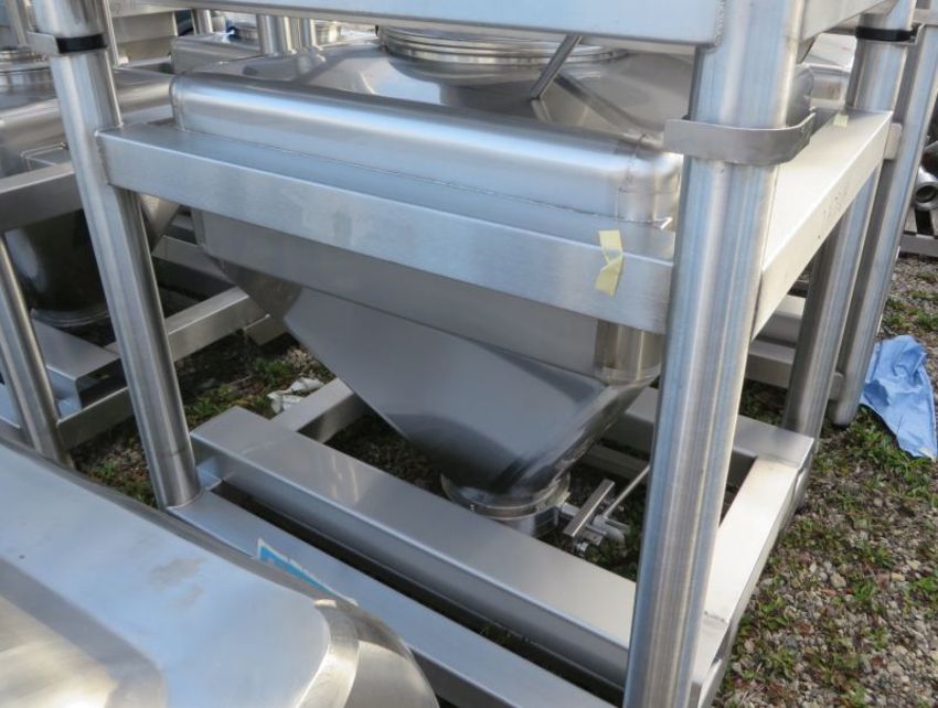 Tote Inc 18 CFT Bin.  135 Gallon Capacity, Stainless Steel.  40" X 34" X 14" Straight Side with a 30" Cone and 10" Diameter Discharge.  Mounted on a Stackable Fork Lift access frame.  18" top-mounted manway.(Located in NY)***NYINC***