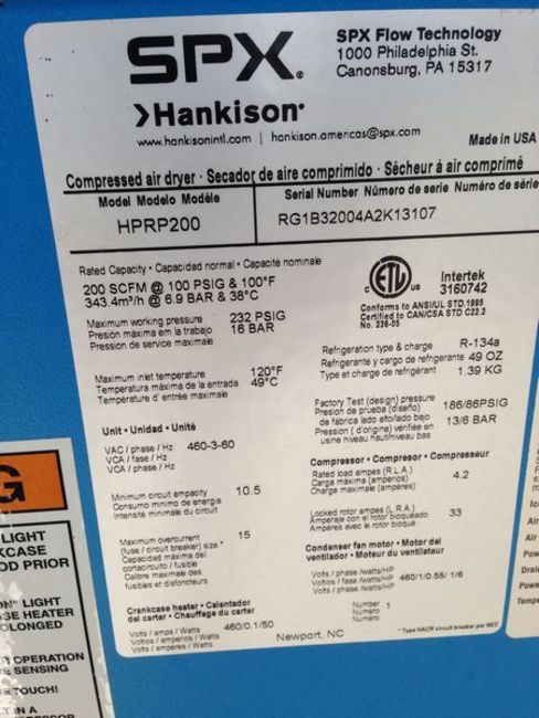 SPX Hankison 200 SCFM Air Dryer Model: HPRP 200 Serial: RG1B32004A2K13107 200 SCFM @ 100 PSIG and 100F, Maximum Working Pressure – 232 PSIG, Maximum Inlet Temperature – 120F, 460 Volts, 3PH, 60HZ, Refrigeration Type and Charge – R-134a (Located in NC) ***FBEV***