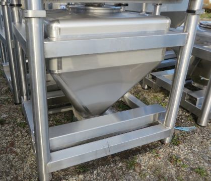 Tote Inc 18 CFT Bin.  135 Gallon Capacity, Stainless Steel.  40" X 34" X 14" Straight Side with a 30" Cone and 10" Diameter Discharge.  Mounted on a Stackable Fork Lift access frame.  18" top-mounted manway.(Located in NY)***NYINC***