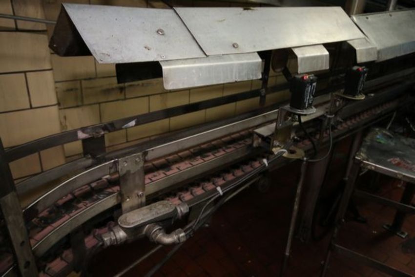 { Choice of lots: 234, 235 (P) } Aprox. 30 ft. L S/S Product Conveyor with 3-1/4" W Plastic Table Top Chain, Side Rails, Leg Supports, S/S Covers and (1) Drive (Note: Rig Fee $845.00)