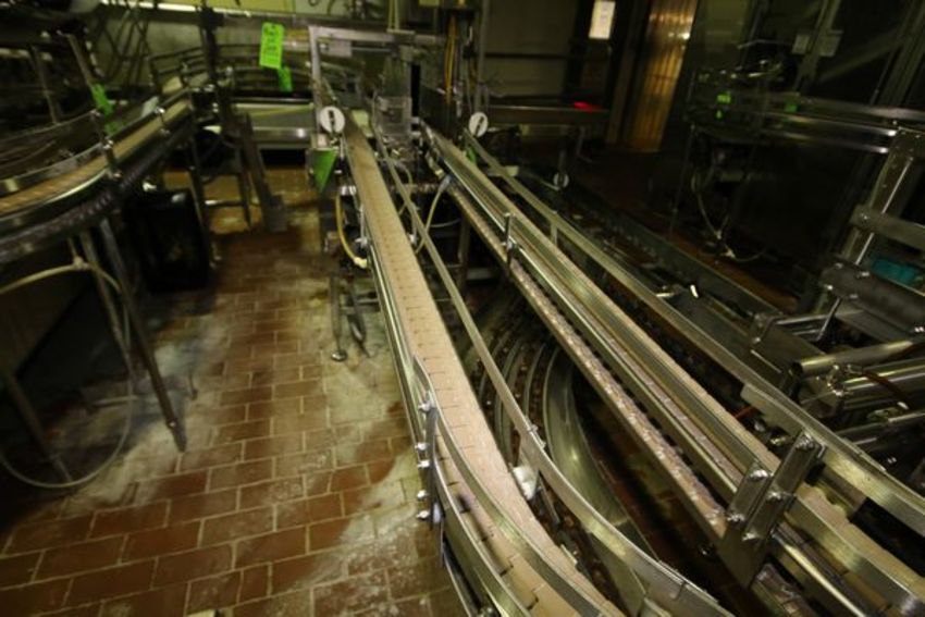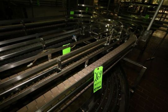 Aprox. 123" L Infeed and Outfeed S/S Product Conveyor with 3-1/4" W Plastic Table Top Chain, Side Rails, Leg Supports, Straight Sections, Bends, Micro-Switches, Lane Divert and (6) Drives (Note: Rig Fee $1950.00)