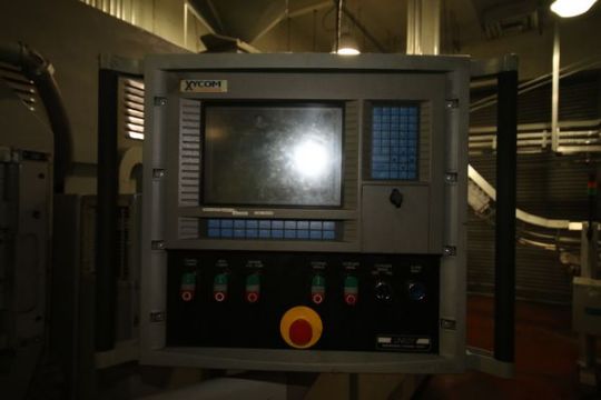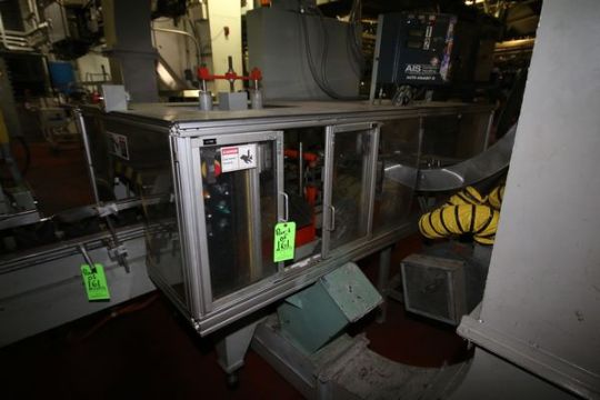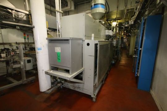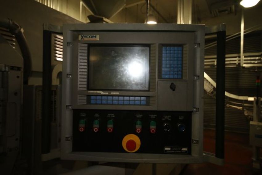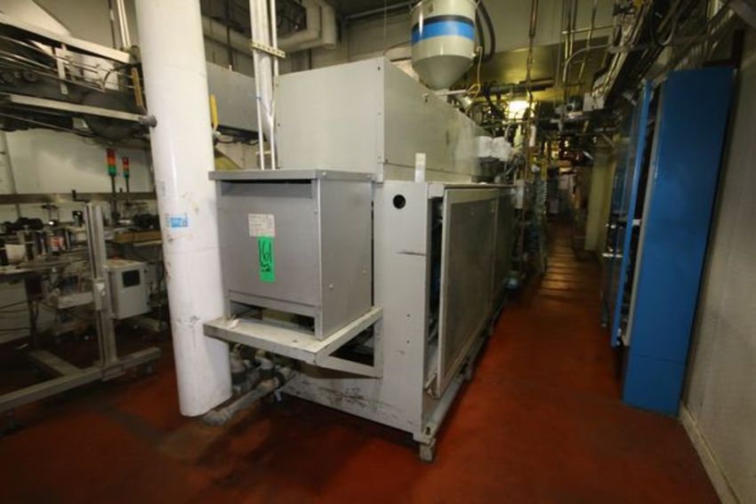 { Group of lots: 161, 162 (P) } Uniloy 6-Head Half Gal. HDPE Blow Molder, Model 350R2, S/N 5112, Set-Up with Platen Size Aprox. 45-1/2" L x 15-1/2" H x 3-1/2" Thickness, Tie Bar Spacing Center to Center Aprox. 38-1/2", Aprox. 8" Head Spacing includes 75 hp Drive with SIemens VFD, Air Barrel Cooling, 15 hp Hydraulic Power Unit, Siemens Simatic 505 and 555 PLC Controls with Xycom Automation Touchpad Display, includes Uniloy Resin Hopper/Loader, Aprox. 67" W x 110" L Cooling Bed, Model 8FTCB, S/N 5112CB, Trimmer, Model 10041, S/N 5112T, (2) AIS Container Handling Auto Adjust II Leak Detectors, S/N 10416 and S/N 10414 (Blow Molder Unit #6) (Note: Rig Fee $4500.00)