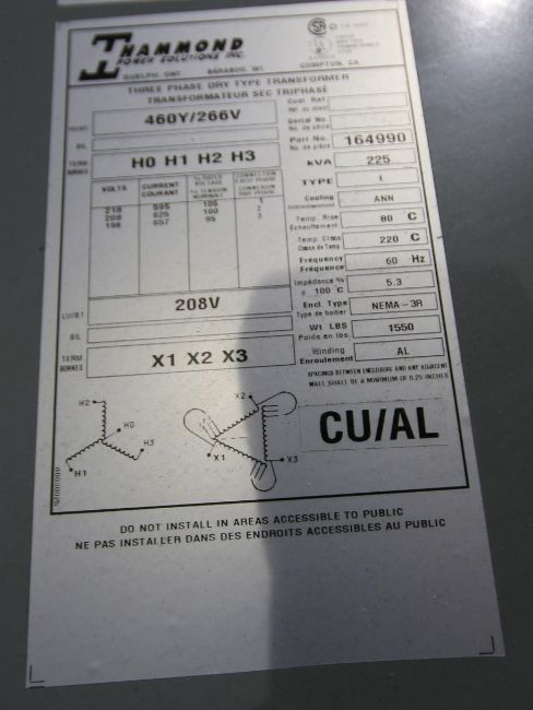 { Choice of lots: 196, 197, 198, 199 (P) } Hammond 225 KVA Dry Type Transformer, Part #164990, 460 Y/266 V, 3 Phase (Operated with Blow Mold Unit #3) (NOTE: Rack Not Included) (Note: Rig Fee $195.00)