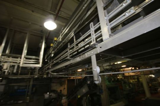 Aprox. 650 ft. Half Gal. Aluminum Jug Conveyor System Running From Blow Mold Room Into Filling Room includes Alpines, Straight Sections, Bends, Drives, Top S/S Covers (Half Gal. Conveyor Can Hold Aprox. 1,950 Half Gal. Jugs) (Note: Rig Fee $11875.00)