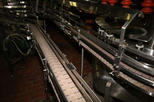 { Group of lots: 274, 275, 276 } Aprox. 95 ft. Infeed and Outfeed S/S Product Conveyor with 3-1/4" W Table Top Plastic Chain, Side Rails, Straight Sections, Bends, Micro-Switches and (5) Drives (Note: Rig Fee $1950.00)