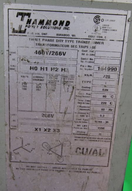 { Choice of lots: 196, 197, 198, 199 (P) } Hammond 225 KVA Dry Type Transformer, Part #164990, 460 Y/266 V, 3 Phase (Operated with Blow Mold Unit #4) (NOTE: Rack Not Included) (Note: Rig Fee $195.00)