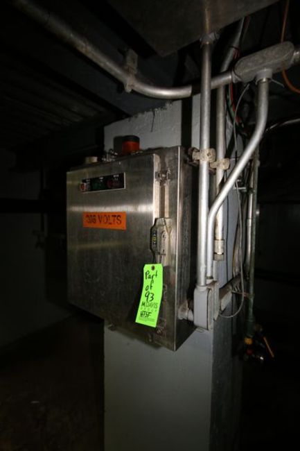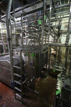 Aprox. 7,000 GPH HTST System includes AGC S/S Plate Press, Model AR56-SH, S/N AGC06313, Fully Outfitted with (380) Pro-5 S/S Plates, (2) Dividers, 4” Top Mounted Nested Holding Tube, Tri-Clover 3” Flow Diversion Valve, Balance Tank, (2) Tri-Clover Centrifugal Pumps, Waukesha Model 130 UI Timing Pump, Anderson 2” Flow Meter, Related Valves, Piping including Shell and Tube Heat Exchanger with Circulating Pump Located in Basement (System #503)  (NOTE:Controls Not Included) (Note: Rig Fee $5120.00)