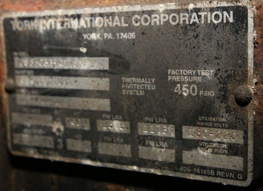 York Chiller with 8-Cylinder Compressor, Model 1583CA-017SN, S/N HM270002W, 100 hp Motor, 5500 RPM, 200 V, 3 Phase (NOTE: Rig Fee $200.00)