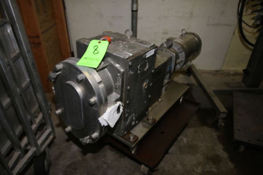 Fristam 5 HP Positive Displacement Pump. Model FKL150. S/N FKL1500205003. 3" Clamp Type Inlet and Outlet. Mounted on S/S Base. Max Speed 600. Baldor S/S Washdown Motor. 1760 RPM. ***Located in Brown Storage Building