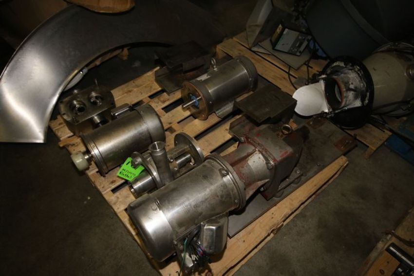 Pallet of Assorted Pump Components. Includes (2) S/S Pump Heads. (1)AMPCO 3" x 2" S/S Clamp Type Head. M/N LCV530-252-18. S/N CC-74267-1-1. (1) Positive Displacement Head. Also Includes (3) Baldor S/S Motors, 5 HP 1760 RPM