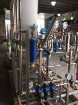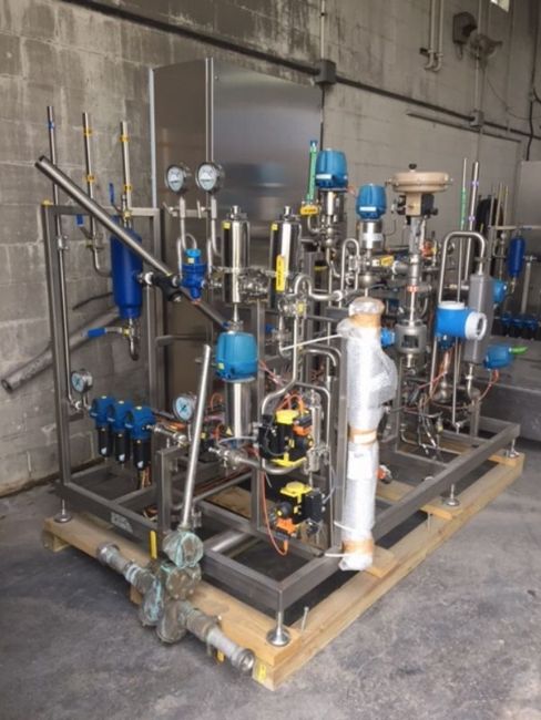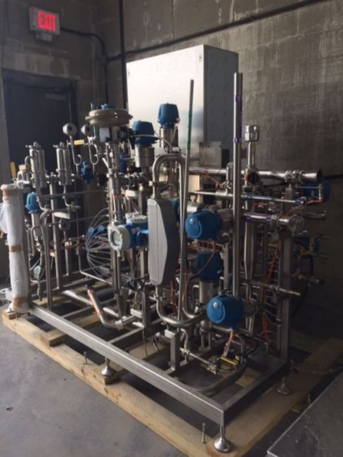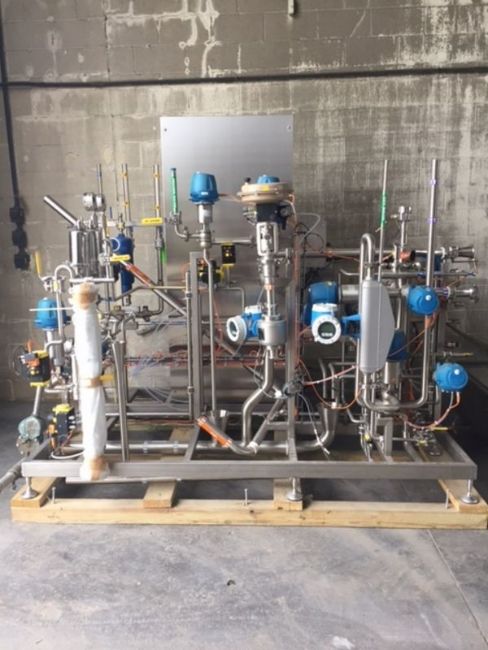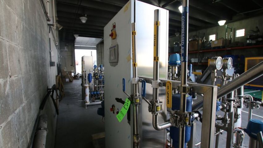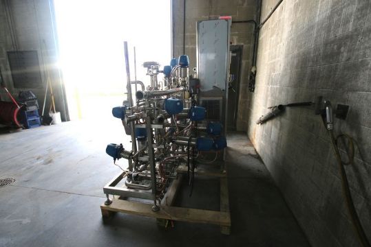 NEW (Never Installed) Boccard Fruit Blending Skid. Includes SPX 3" Inline Static Mixer, (13) GEA Valves, (2) Endress Hauser Flow Meters with Digital Read Outs (Model Promass S & Promag H), Endress Hauser Liquicap M Probe. S/S Control Panel Equipped with Allen Bradley 5-Slot Contoller with DeviceNet PLC (Cat # 1769 ECR), Allen Bradley 3 HP PowerFlex 40 VFD, AB 1606 Power Supply