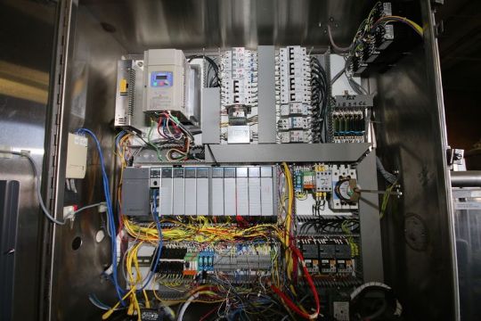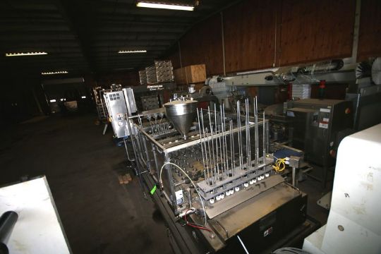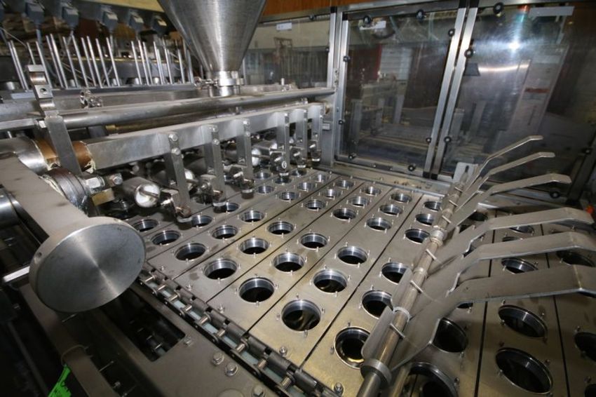 Modern Packaging 6-Wide Cup Filling Line. Model Sl1X6. S/N MP481. Currently Set-Up with 3" Diameter Cup Molds. S/S Control Cabinet with Allen Bradley 10 Slot Controller with SLC 500 & Hitachi VFD. Allen Bradley PanelView Plus Operator Touch Screen.