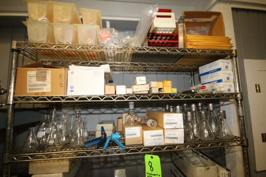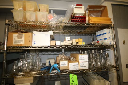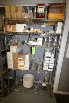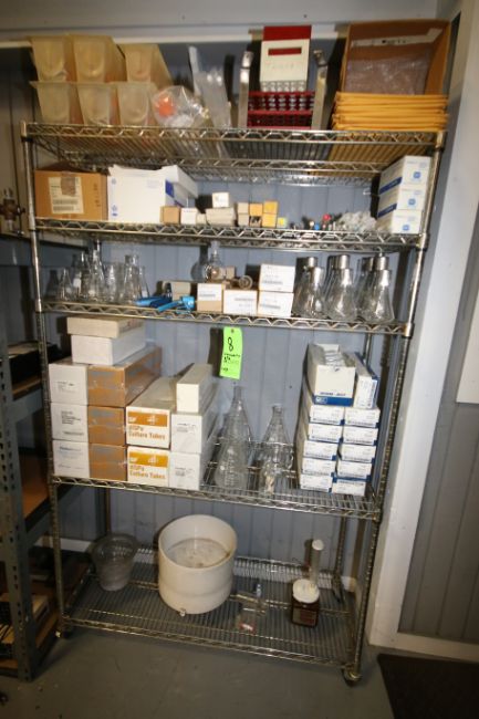 Contents of Rack includes: Assorted Lab Glassware includes Flasks, Beakers, Culture Tubes, Syringes, Hydrometers, Steel Racks, Assorted Plastic Bottles and Containers located on Top of Rack (NOTE: Rack Not Included)