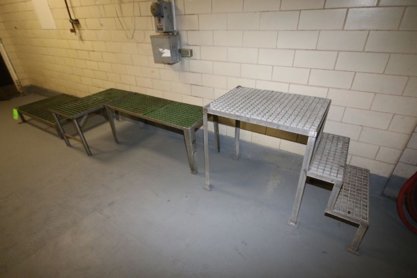 (4) Pcs S/S & Steel Operators Platform & Stair Platform, Includes 90" L x 24" W x 15" H, 48" L x 30" W x 10" H - L - Shaped, 46" L x 24" W x 33" H Stair Platform, Most with Plastic Grating (Located in San Antonio)**LULU**