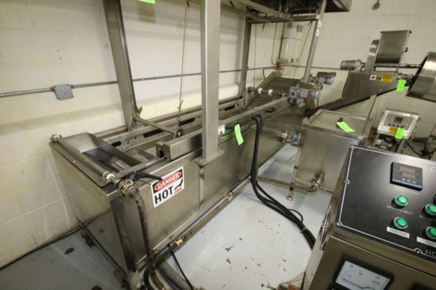 S/S Continuous Fryer with Exhaust and Fire Suppression System, Fryer Approx. 15' x 4', Supression & Exhaust Hood Approx. 15', Aprox. 18" Wide Interior Conv. With Incline, 220V, 3 Phase***Located in NY***