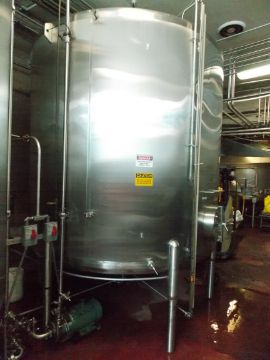 Cherry-Burrell 4,500 Gallon Vertical Mixing TankStainless Steel Construction #4 Finish Inside, Side Manway, 5HP Side AgitationCIP Spray ball, Dome Top – Dome Bottom – 12 Gauge, Center Discharge on BottomMultiple Inlets at Top, Last used in Beverage Application(Located in NC) ***FBEV***
