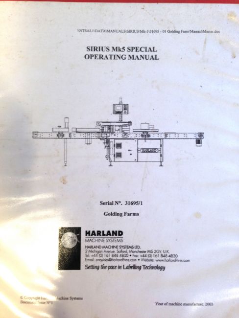 Harland Front and Back Pressure Sensitive Labeler Model: Sirius MK5 Serial: 31695-02 Year: 2003Last running multiple sized non-round PET and HDPE Bottles for the Food/Sauce Industry, Variable Frequency Drive Controls, Allen Bradley Operator Touchscreen 550 Controls, Integrated 8?conveyor, Stainless steel Construction **Subject to Seller Confirmation** (Located in NC) ***FBEV***