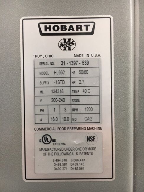 Hobart Mixer, Model HL 662, S/N 31-1397-539, Legacy Series, Digital Controls, 200 - 240V, 50/60 Hz, 1,200 RPM, 2.7 HP (Located in Montana)***WFARE***