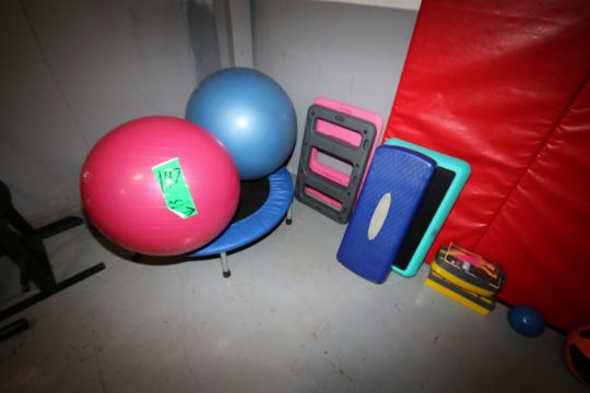 { Group of lots: 143, 144, 145, 146, 147, 148 } (16) Pcs. - Assorted Exercise Equipment includes (2) Exercise Balls; Mini 36" Exercise Trampoline; (2) Exercise Step Decks; Valeo 6-lb Weighted Fitness Ball; Sport Time Strength 5 kg Medicine Ball; Yoga Mat; Century Wave Core Bag and (2) AAI Exercise Mats